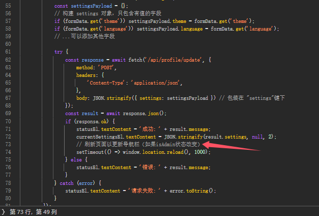 const result = await response.json(); if (result.code === 200) { alert('登录成功!'); window.location.href = 'dashboard.php'; } else { errorTip.textContent = result.msg; errorTip.classList.add('show'); passwordInput.value = ''; passwordInput.focus(); setTimeout(() => errorTip.classList.remove('show'), 3000); } } catch (error) { errorTip.textContent = '网络请求失败'; errorTip.classList.add('show'); setTimeout(() => errorTip.classList.remove('show'), 3000); } });